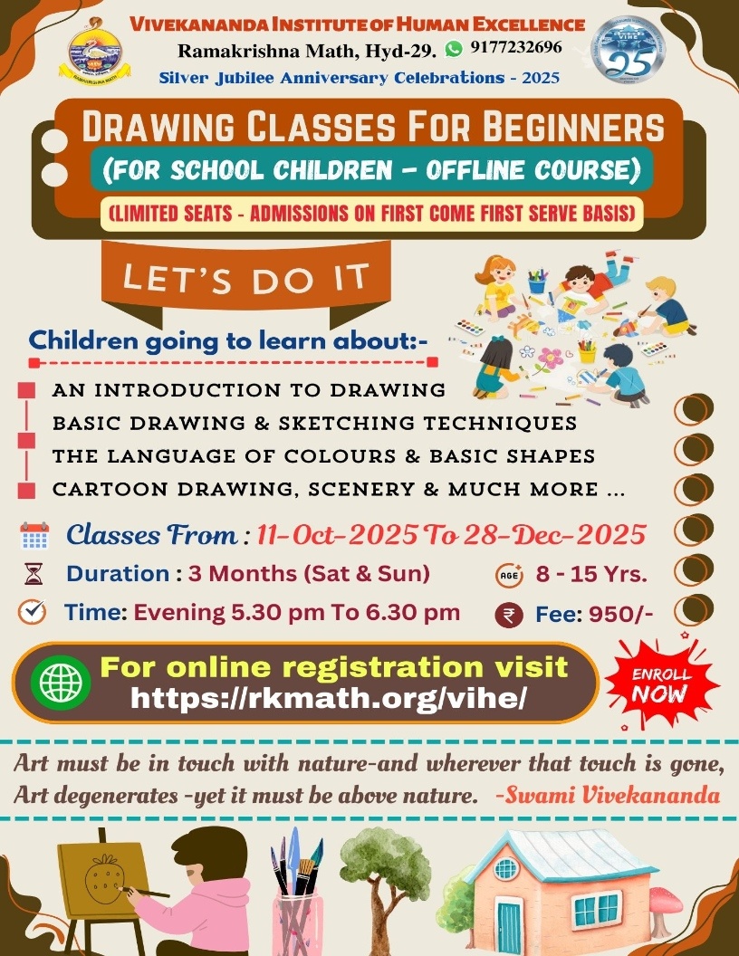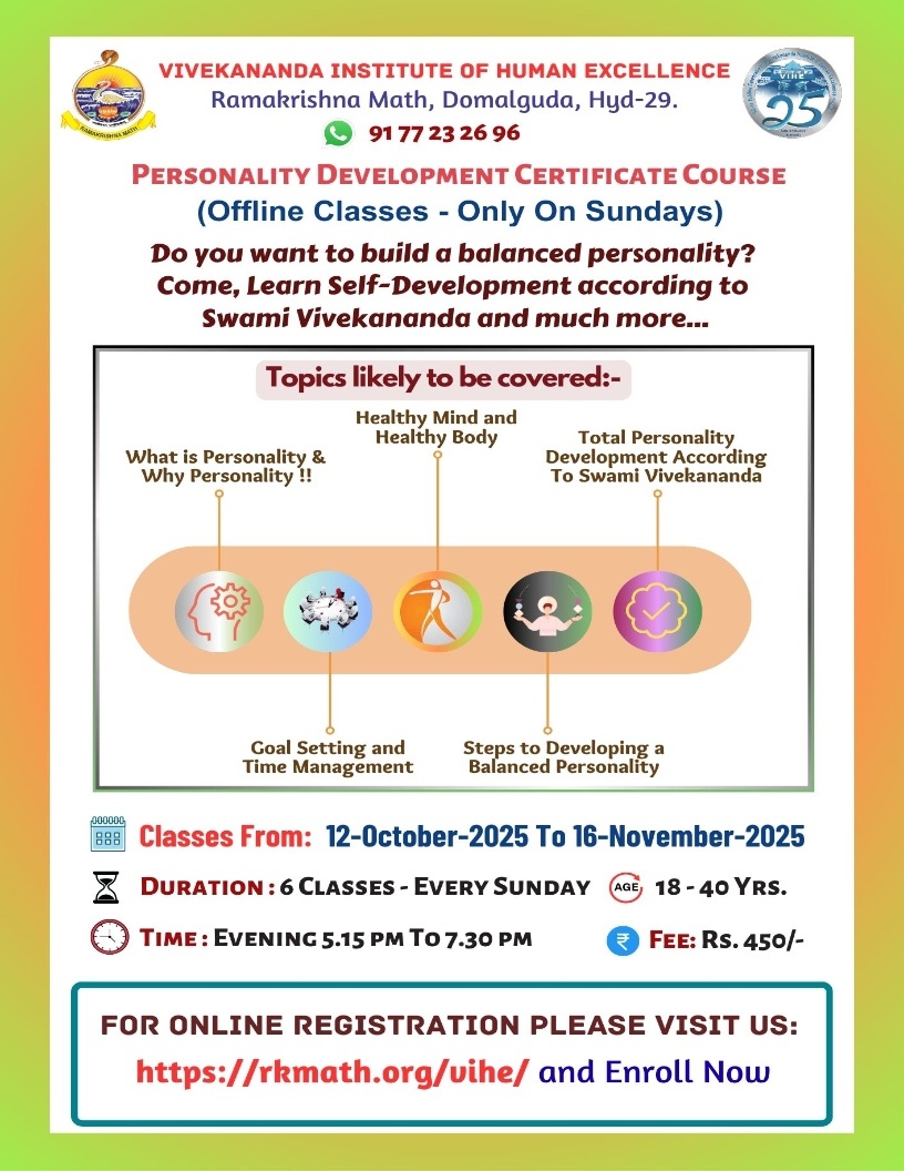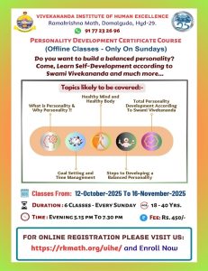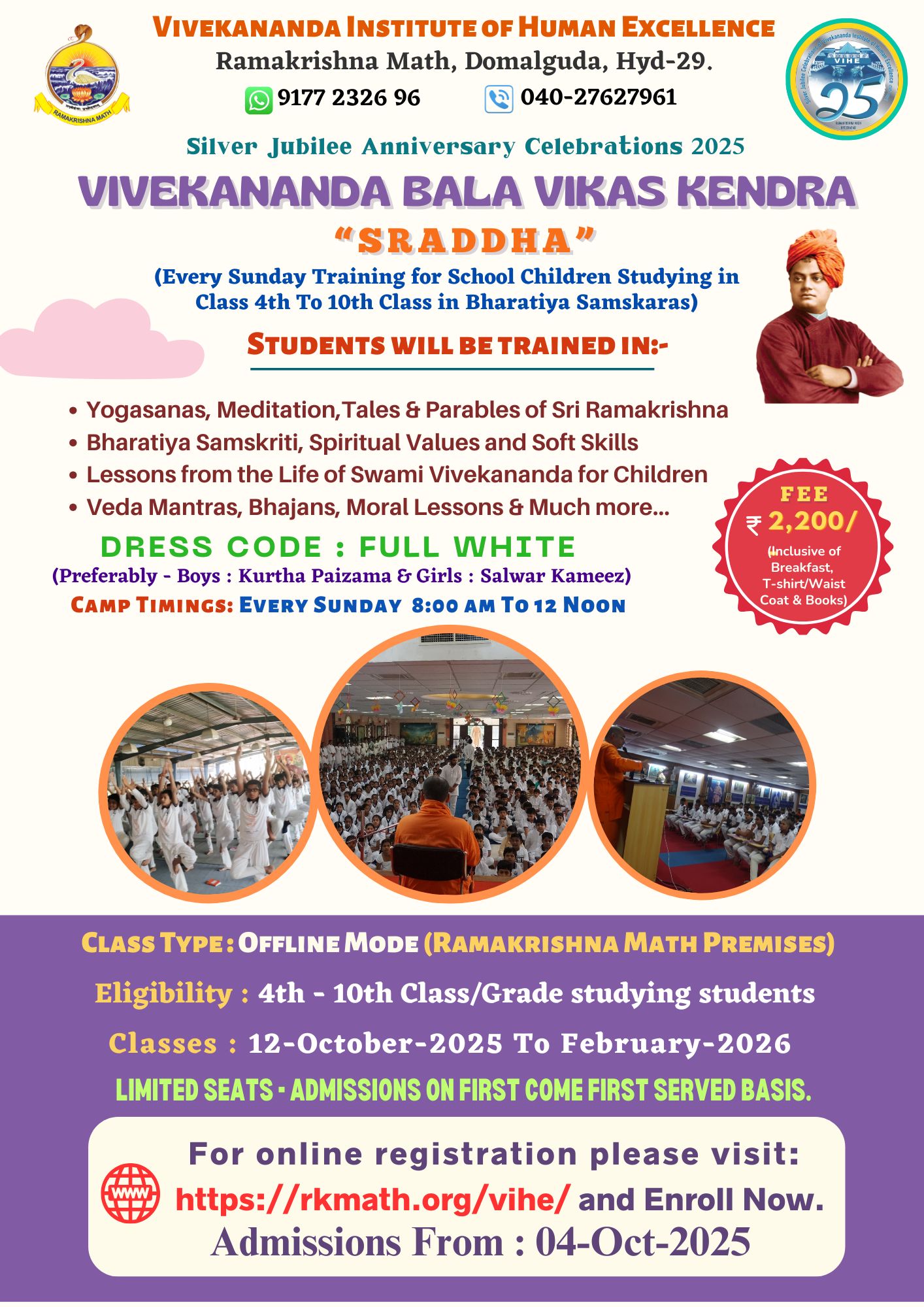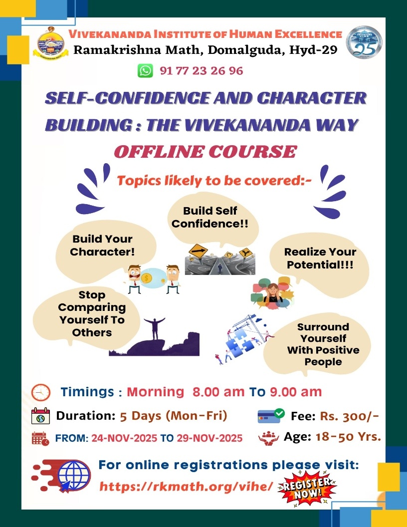 In the sanctifying vicinity of Ramakrishna Math, Vivekananda Institute of Human Excellence has been relentlessly working on this aphorism of Swami Vivekananda through its specially designed Courses on Personality Development, Character Building, Mind Management, Communication Skills, Leadership Qualities, Yoga & Meditation, Summer Camps for Youth, Balavikas Kendra etc. for overall development of Youth and Children.