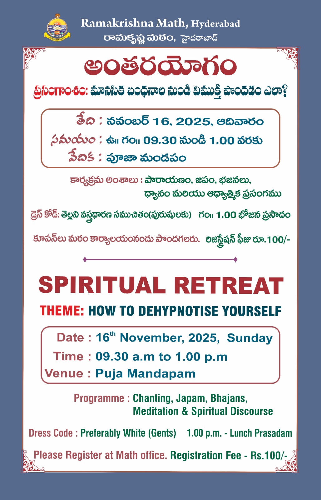 Ramakrishna Math, Hyderabad is a branch center of Ramakrishna Math & Ramakrishna Mission, Belur, Howrah, West Bengal.