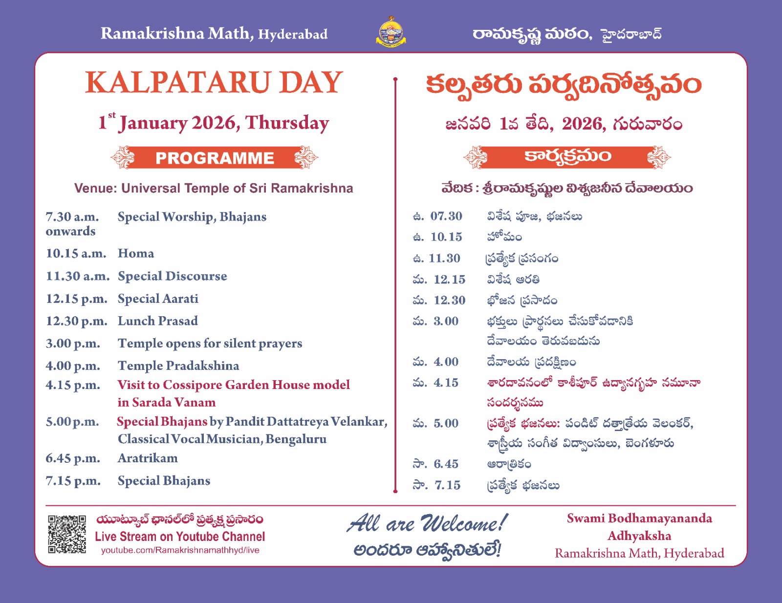 Ramakrishna Math, Hyderabad is a branch center of Ramakrishna Math & Ramakrishna Mission, Belur, Howrah, West Bengal.