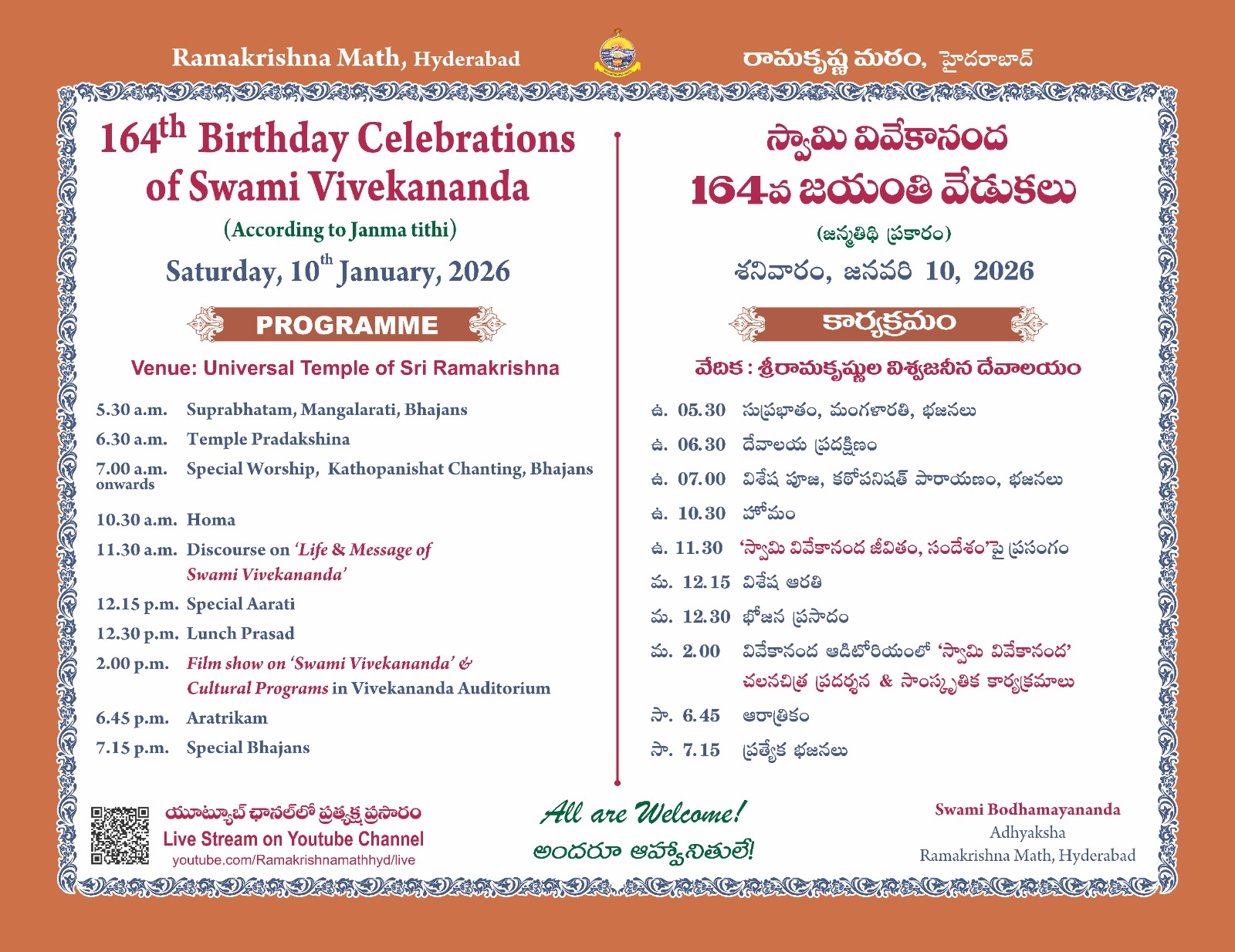Manifesting Swami Vivekananda’s preaching ”Shiva Jnane Jiva Seva — Service to Man is Service to God”  into action, Ramakrishna Math, Hyderabad has taken up  various service and educational activities. These activities are carried out by the cooperation of our Devotees, Volunteers & Admirers through their active participation in the activities and/or through financial contribution to the different Funds of the Math.