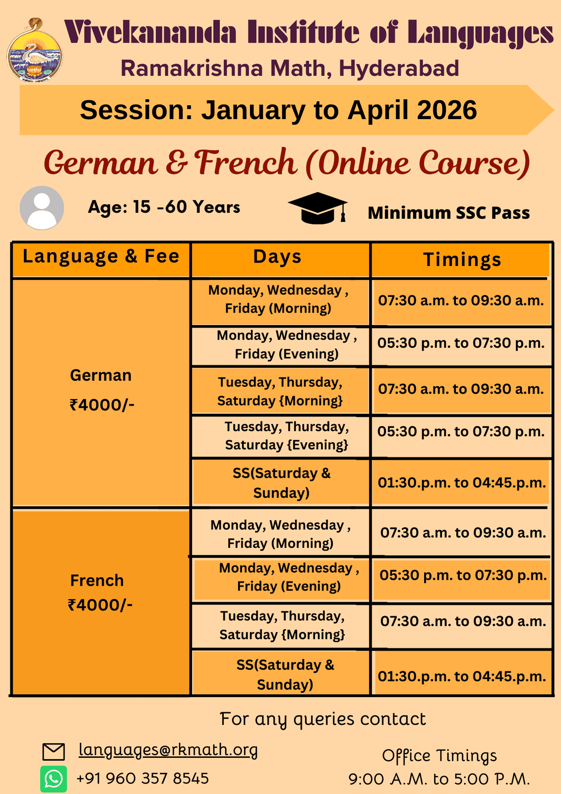 The duration of each session is three months. For all languages, including Spoken English there are three sessions in an academic year i.e. in the months of January, June and September . Students have to join the courses only at the start of any session..