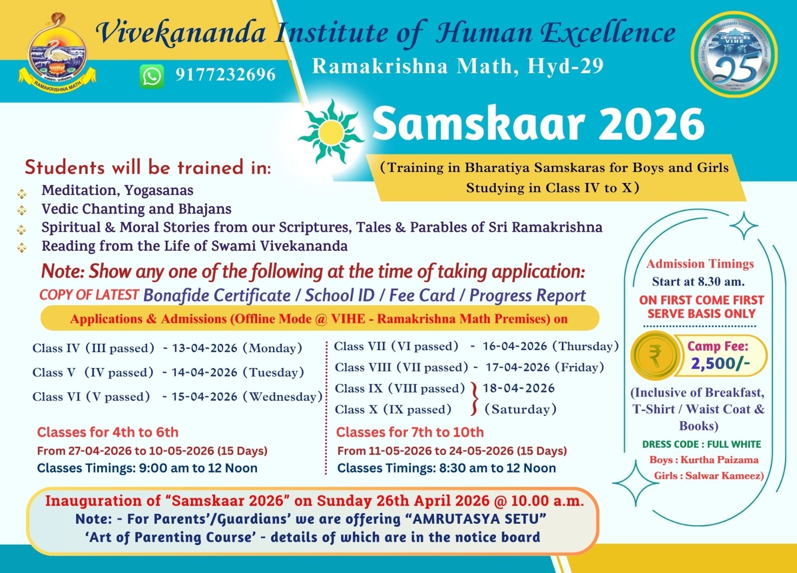 Inauguration of "Samskaar 2026" on Sunday 26th April 2026 @ 10.00 a.m. Note: - For Parents'/Guardians' we are offering "AMRUTASYA SETU❞ 'Art of Parenting Course' - details of which are in the notice board